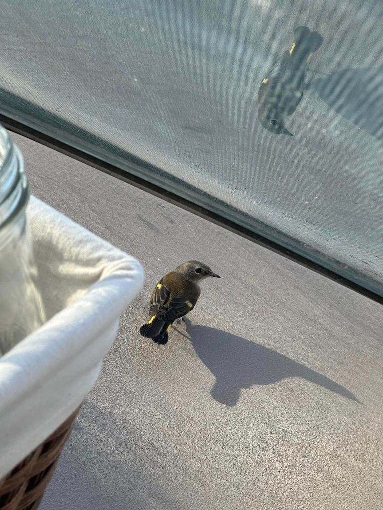 I almost forgot, we had a visitor Tuesday morning! A tiny little birdie flew into our boat!