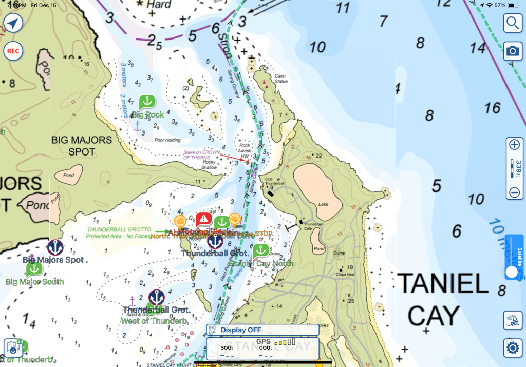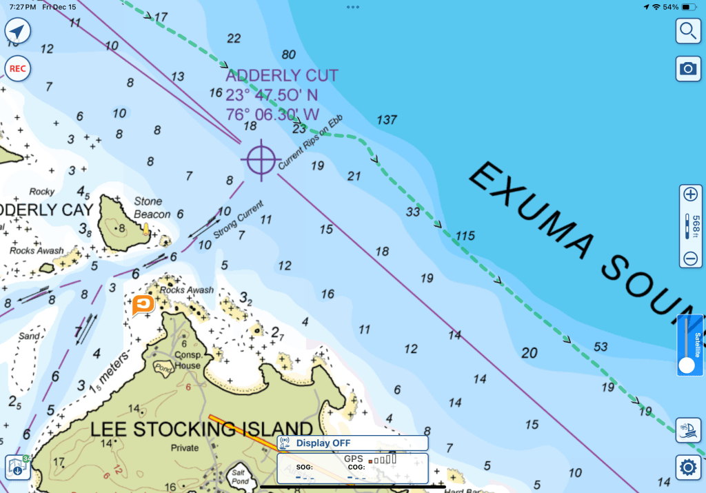 We stayed fairly close to land, maybe 1-1.5 miles out. Each time we went by a cut I needed to hand steer and turn us into the waves as the waves seemed to intensify even that far away. Below is a good example. As we went past Adderly Cut you can see our track (the green line) with a turn into the waves then heading back in our general direction we want to go.