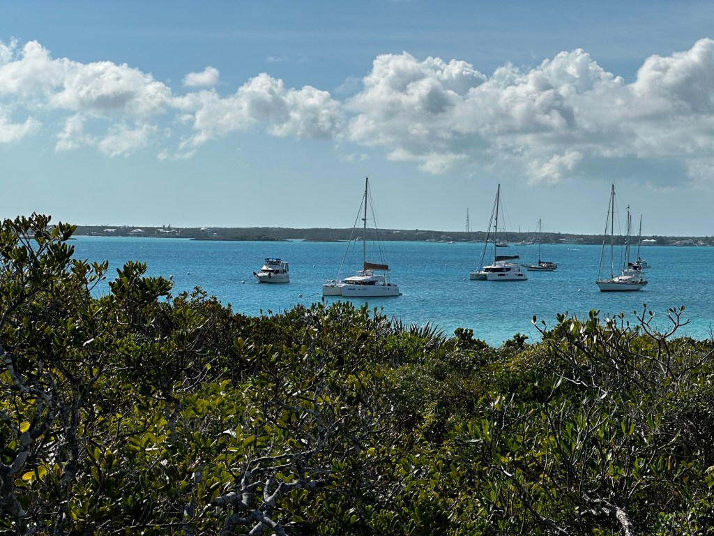 January 14, 2024 was a travel day as we left the mooring field at Sand Dollar Beach at Stocking Island. Our intended destination was Hooper’s Bay. But, once we got in there it was looking rocky. Thinking back, with the position of the sun, I don’t believe we could see the bottom very well and it was probably grass patches and not rocks.