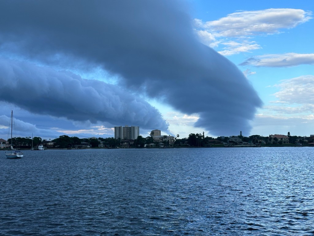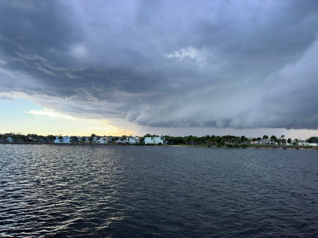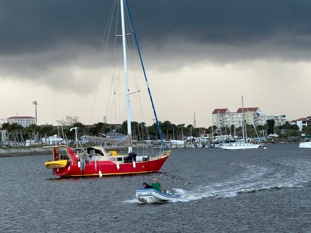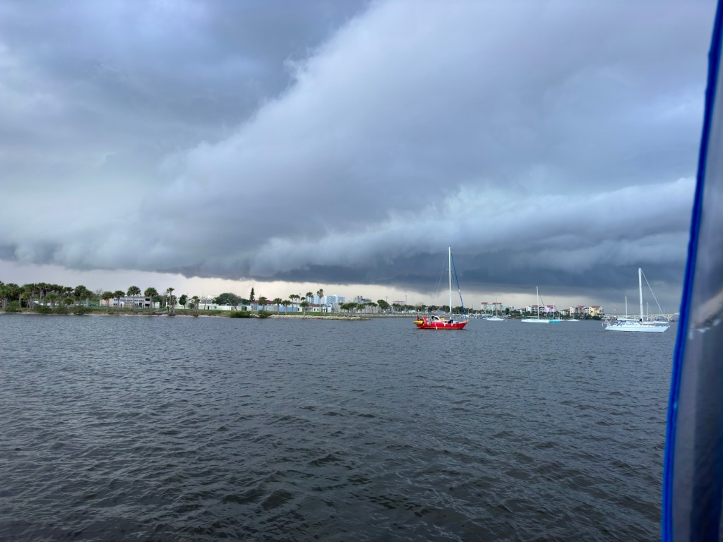 We made it to our spot without incident and found a spot we both liked. Grabbed a bite to eat and looking at the sky I thought I better get Jazzy’s walk in. We made it back to the boat just in time as a hard down pour came with some very strong wind.