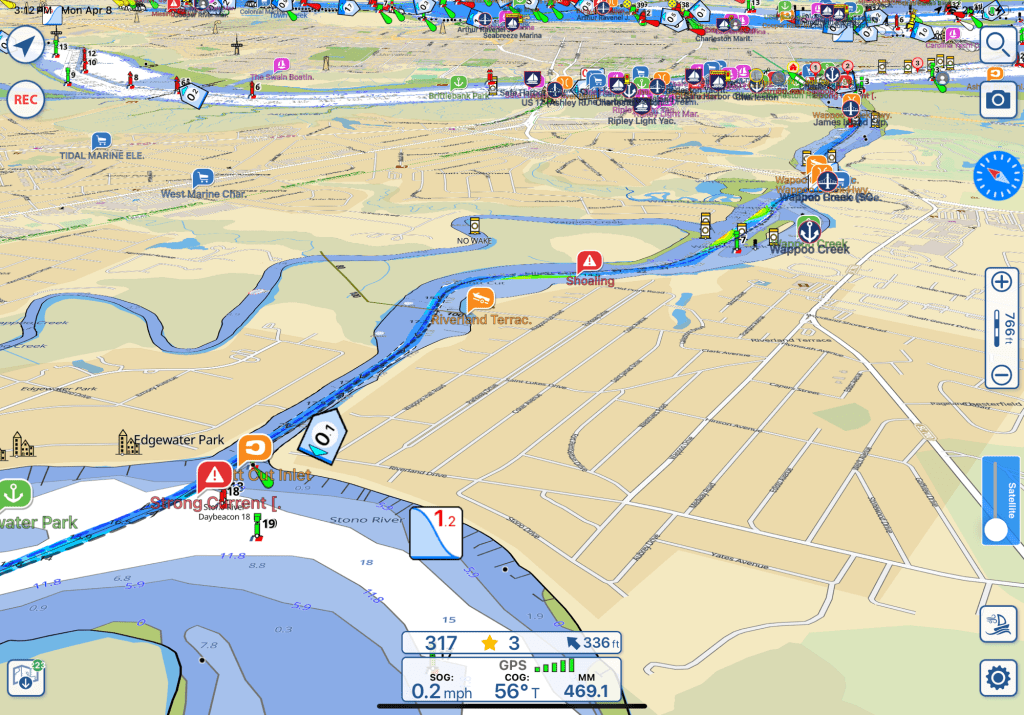 The “feature image” is our overnight anchoring (green line.) We didn’t move much at all last night. Most of the black line is our track from getting anchored then leaving the anchorage.
